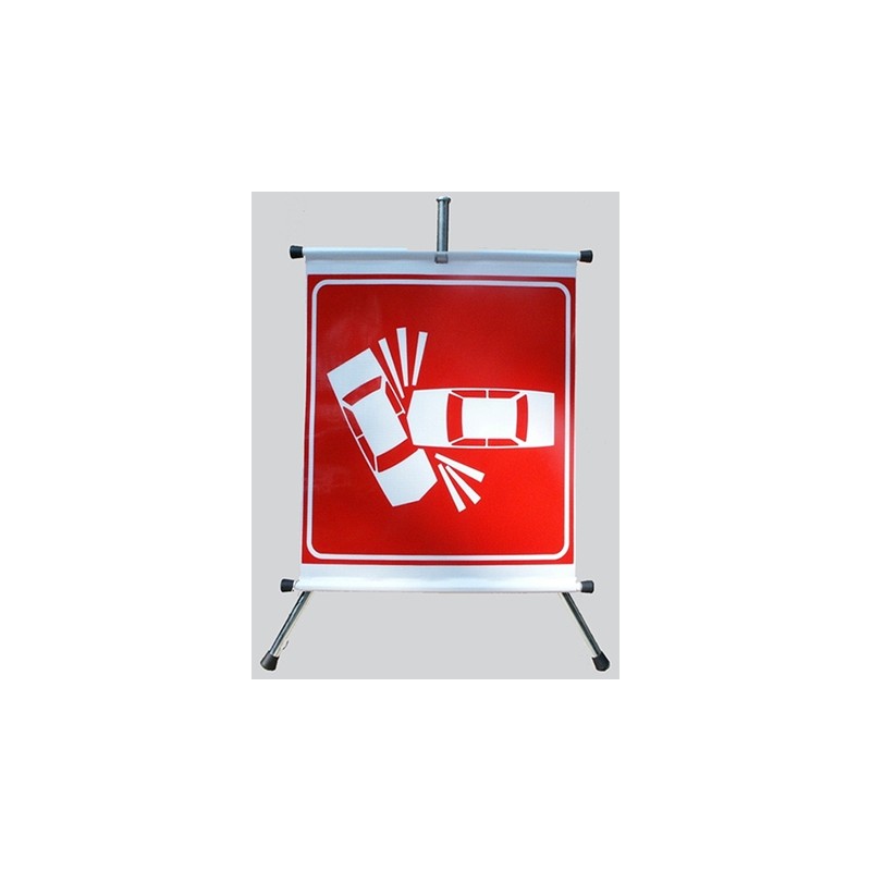 13.02.291 - Borsa segnale stradale avvolgibile Segnale stradale temporaneo formato da un telo rifrangente, stampato con inchiostri serigrafici trasparenti, sostenuto da uno stativo adatto al posizionamento verticale. Il tessuto rifrangente MICROPRISMATICO, garantisce il 100% della rifrangenza notturna, nel rispetto dei colori dei simboli stampati, al pari dei segnali stradali, anche in caso di nebbia o pioggia. Stativo a scatto in ferro zincato tubolare. La struttura metallica di supporto non ha profili a “spigolo vivo”; è robusta e di facile manovrabilità nel posizionamento e nell’operazione di recupero. Il tutto è contenuto in una borsa in nylon impermeabile che ne facilita il trasporto. Segnale standard: Ingombro aperto h. 120 cm x base80x80x80cm5 - Ingombro da chiusoh. 78 cm x 8 x 15 cm - Peso 4,80 Kg 13.02.291– Simbologia formato cm. 60 x 60 13.02.292– Simbologia formato cm. 60 x 90.